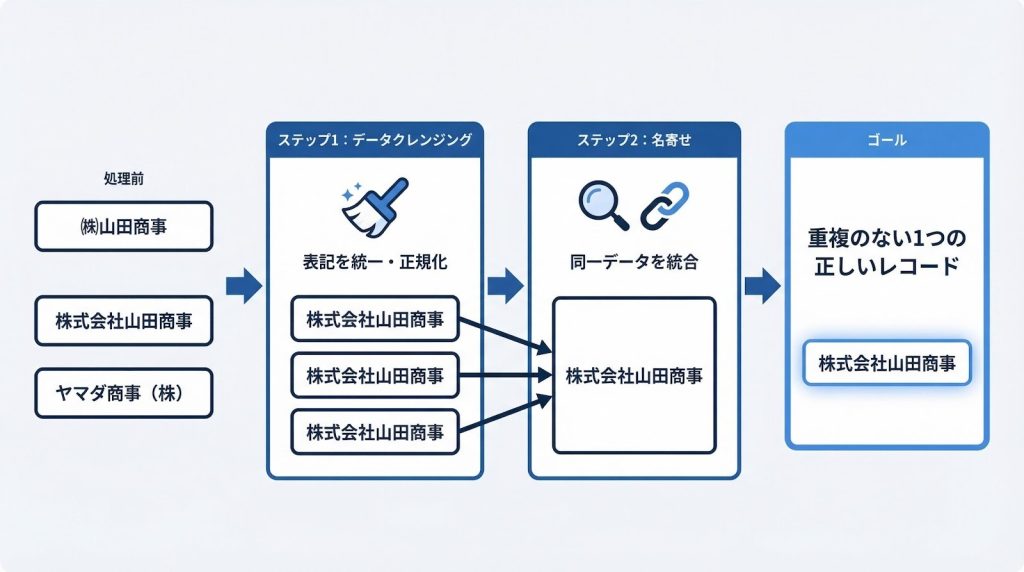名寄せとは、複数のシステムやデータソースに存在する同一企業・同一人物のレコードを検出し、1つに統合する処理です。一方、データクレンジングは表記の正規化、つまり全角・半角の統一や略称の展開といった「表記を揃える」作業を指します。