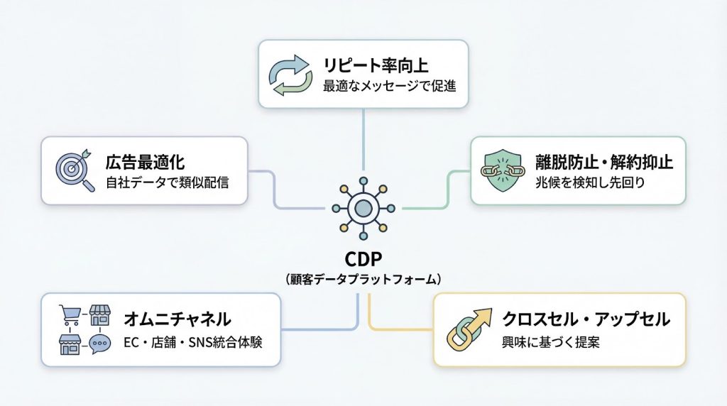 CDPを導入することで、D2C事業者はデータに基づいた多様な施策を展開できるようになります。ここでは、成果が出やすい5つの施策パターンとして、リピート率向上、離脱防止、クロスセル、オムニチャネル、広告最適化を取り上げます。それぞれの狙いと、1st Party Data活用の重要性について見ていきましょう。