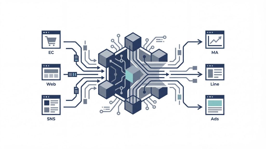 CDPを中心としたデータフロー(収集・統合・分析・実行)の全体像を理解することは、導入を成功させる第一歩です。この章では、CDPがどのように各ツールを繋ぐデータハブとして機能するかを説明し、Shopify、LINE、MAツールなど周辺ツールとの具体的な連携パターンと、構築時の注意点を整理します。