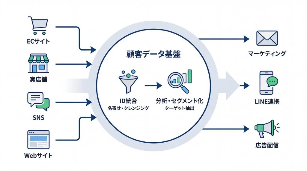 CDPは、EC、店舗、Web、SNSなどの各層からデータを収集し、ID統合を経て施策ツールへ受け渡す役割を担います。データの「収集・統合・分析・施策」の各フェーズにおいて、一貫したID管理とクレンジングが不可欠です。