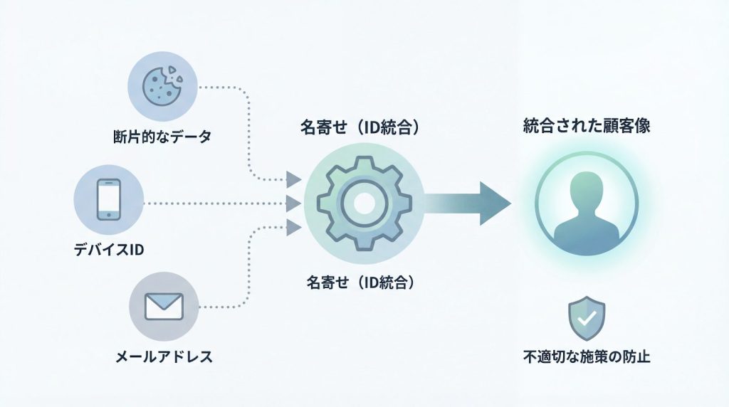収集したデータを施策に活かすには、バラバラの識別子を同一人物として紐付ける「名寄せ」が必要です。たとえば、同じ顧客がスマートフォン、パソコン、店舗の3つの接点で行動した場合、それぞれ異なるIDが割り振られていると、別人として扱われてしまいます。
