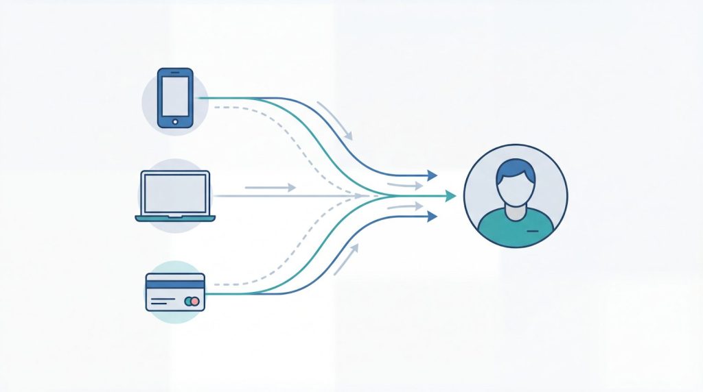 CDPは、メールアドレスや会員ID、電話番号といった確定情報を軸に、複数のデバイスやチャネルを跨いだ行動を一人の顧客として統合します。