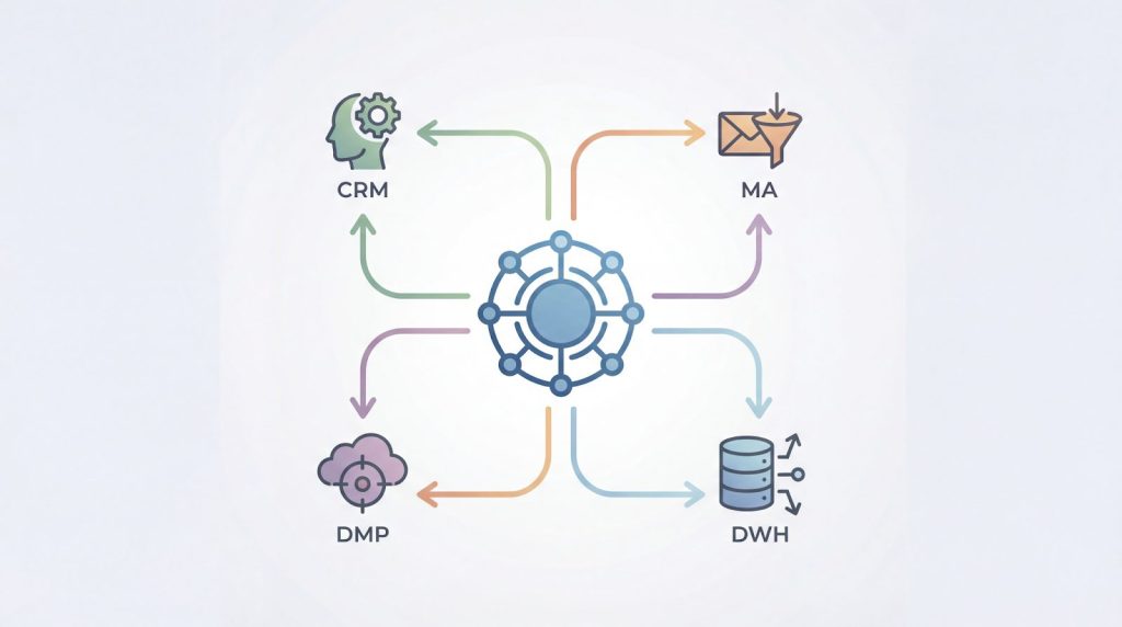 CDPは、CRMやMA、DMP、DWHといった既存ツールと混同されがちですが、それぞれ役割が異なります。CDPは既存のシステムを置き換えるのではなく、顧客理解の深化に特化したハブとして機能し、各ツールを活性化させる立ち位置にあります。ここでは、各ツールとの機能的な違いを整理し、どのような役割分担になるのかを明確にします。