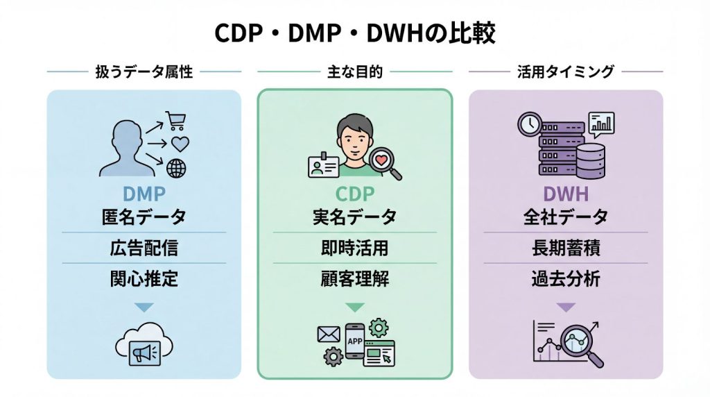 | CDP | 顧客データの統合と即時活用 | 実名の顧客行動データ | マーケティング |