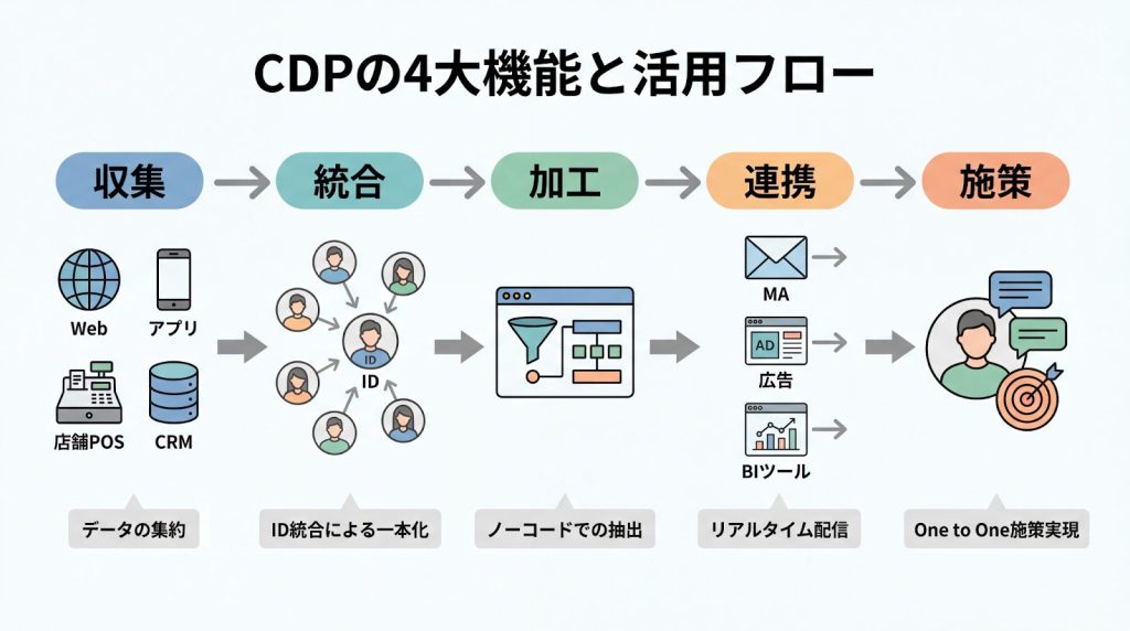 CDPの4大機能とは?収集・統合・加工・連携の役割と活用フロー