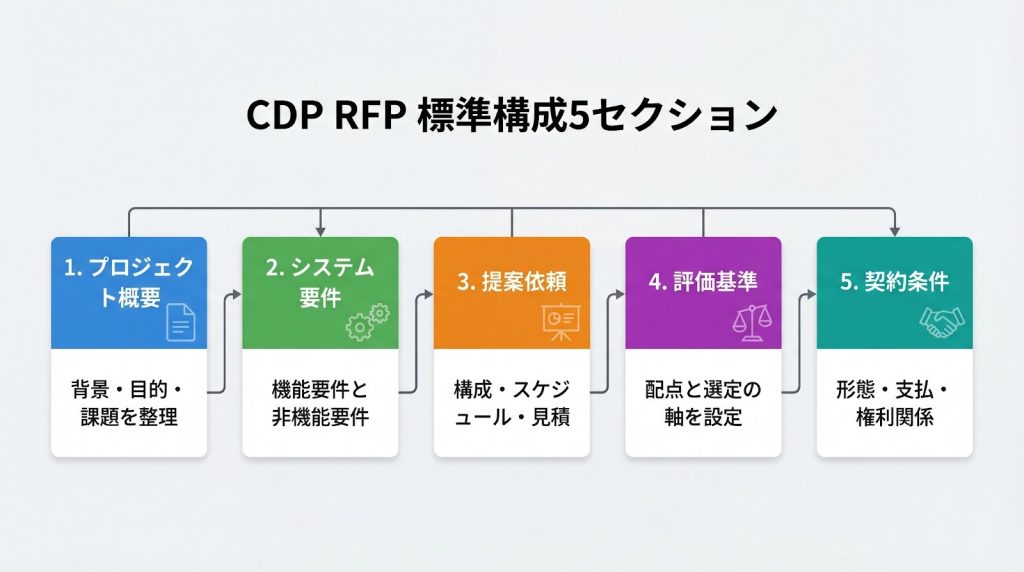 CDP導入を成功させるためには、ベンダーが正確な提案を作成できるよう、RFPの構成を体系的に整理することが不可欠です。