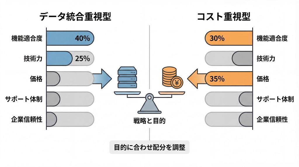 ビジネスインパクトが大きい機能適合度や、導入の確実性を左右する技術力の配点比率を解説します。自社の優先順位に応じたカスタマイズ例を示します。