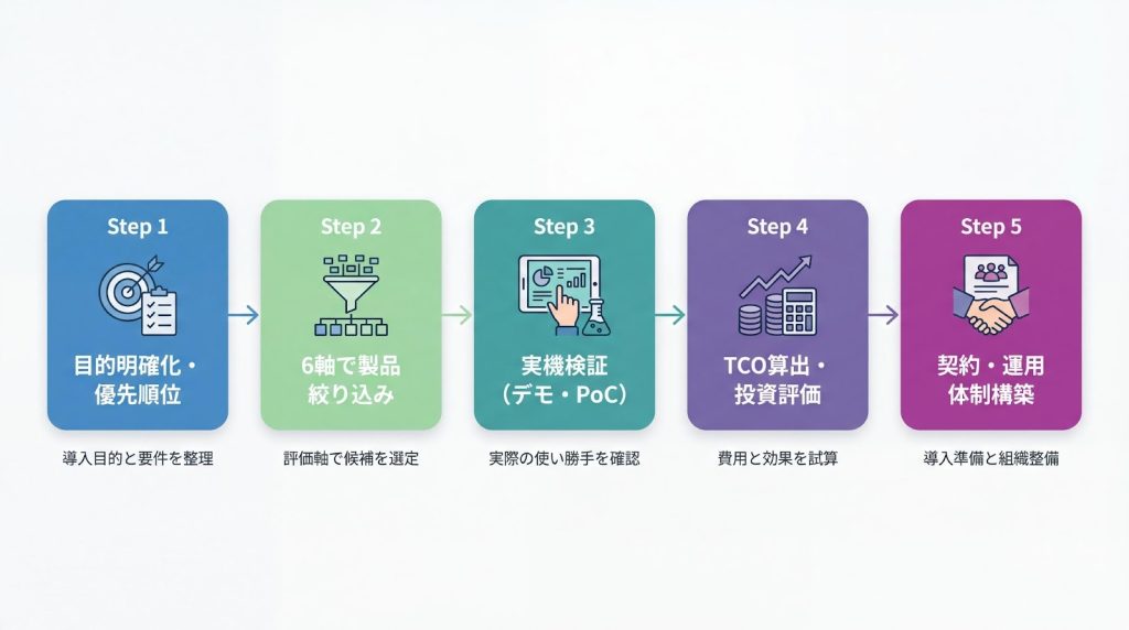 この章では、各ステップで作成すべき成果物や、よくある失敗パターンを避けるためのヒントを5つのステップを時系列で解説します。標準的な選定プロセスに沿って進めることで、検討漏れを防ぎ、組織内での合意形成をスムーズに行いましょう。