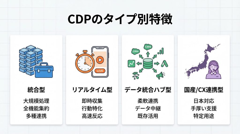 本記事では、機能範囲と主な用途に基づき、CDP製品を「統合型」「リアルタイム型」「データ統合ハブ型」「国産型」に分類しています(業界標準の分類とは異なる場合があります)。