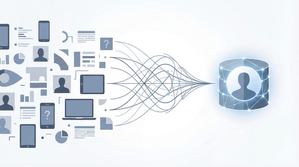 CDPの核心的な機能であるID統合(名寄せ)は、顧客データ活用の成否を左右する重要な要素です。匿名ユーザーが会員登録した際の紐付けや、異なるデバイスからのアクセスを同一人物として認識する処理の精度が、施策の効果に直結します。