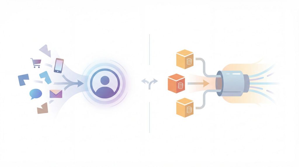 CDPは、複数のチャネルから集まる顧客データを個人単位で統合し、リアルタイムなマーケティング施策を可能にするプラットフォームです。Webサイトの閲覧履歴、ECサイトでの購買データ、店舗での来店記録、メールの開封情報など、バラバラに存在する顧客の行動を一つのプロファイルにまとめ上げます。