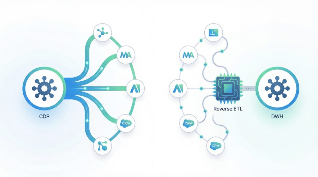 データの「出口」における利便性は、施策の実行スピードに直結します。CDPはMAや広告プラットフォームへの標準連携機能を持ち、設定後すぐに施策を開始できます。一方、DWHからデータを戻すには、リバースETLと呼ばれる追加の仕組みが必要になります。