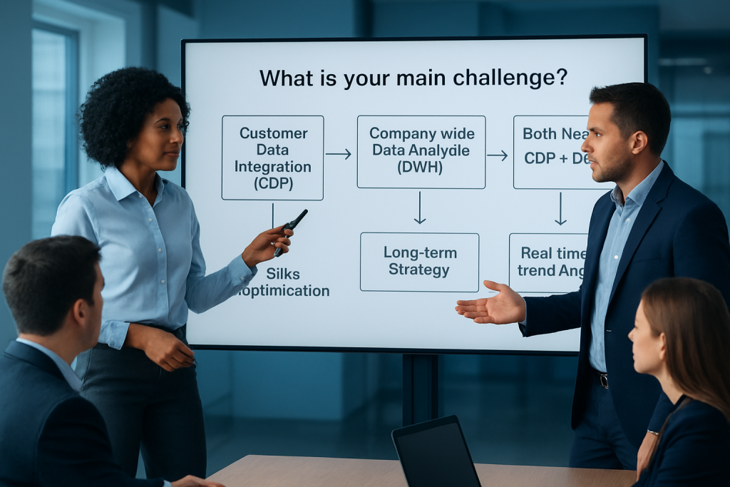 | 解決したい課題の優先順位を明確に | 「顧客データを統合したい」という漠然とした目的ではなく、「追客の優先順位を明確にして成約率を20%向上させたい」「データ集約作業を自動化して中堅社員の工数を月40時間削減したい」といった具体的な課題と目標を設定。課題が明確になれば、CDPとDWHのどちらが適しているか、あるいは両方必要かが見えてくる |