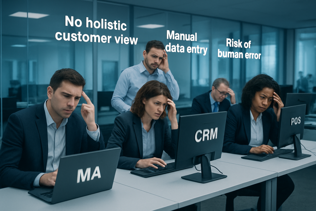 各ツールに蓄積されたデータは異なる形式で保存され、顧客IDの紐づけ方もされていません。オンラインでの顧客タッチポイント(Webサイトでの行動履歴やMAで計測した情報)と、オフラインでのタッチポイント(店舗の会員情報、購買データ、名刺情報など)が分散し、本来同じ顧客の情報がSFA、CRM、MA、基幹システムなどに別々に格納されています。