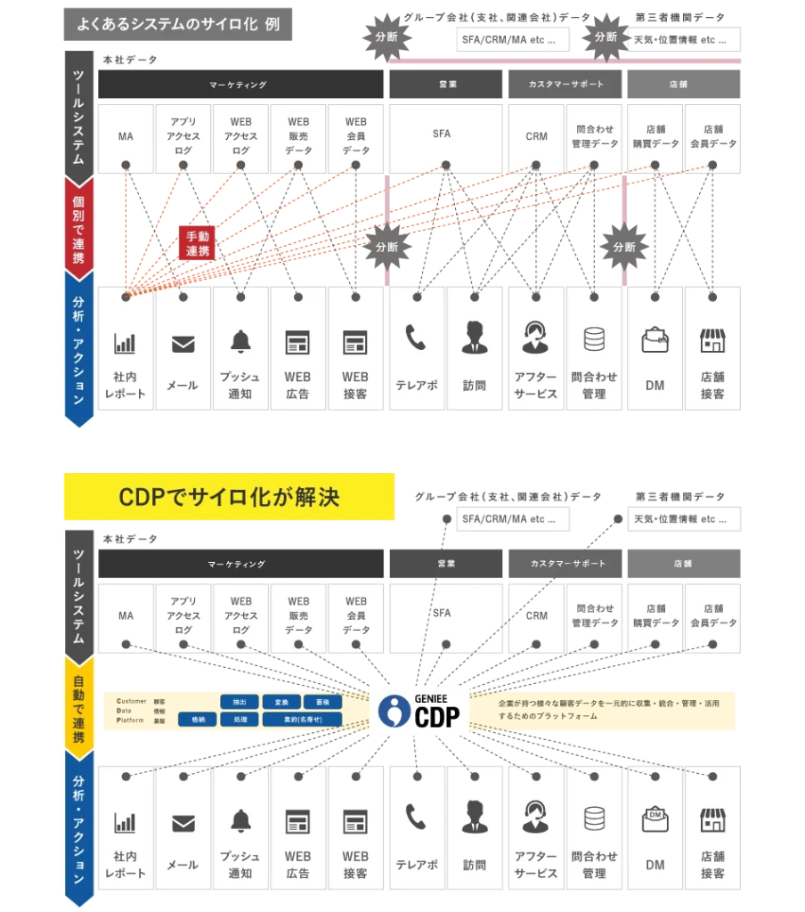 GENIEE CDPなどAI機能を搭載した次世代型CDP等、つまり統合AIデータプラットフォームとSFAやCRMシステムを連携することで実現可能な仕組みです。