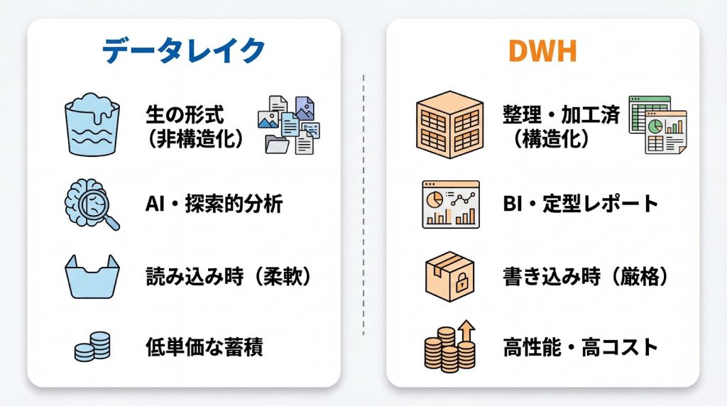 DWHは、スキーマ定義によるデータ品質の担保と、BI分析におけるパフォーマンス上の優位性を持ちます。売上や顧客情報など、一貫性と正確性が求められる定型データの高速集計・分析においてDWHは不可欠です。