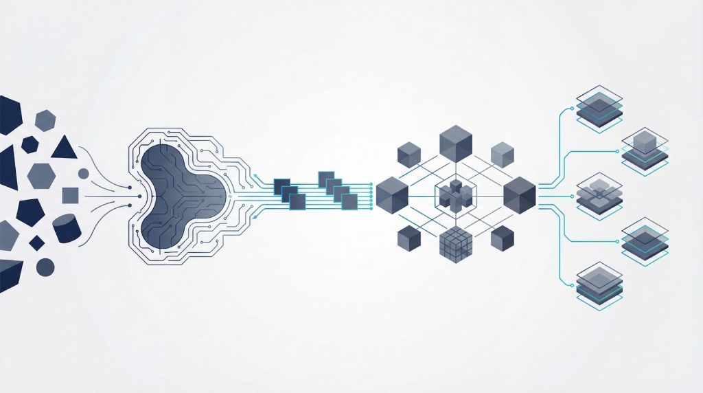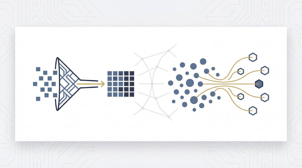 ソースから収集、蓄積、整理、最適化へと至る標準的なパイプラインは、以下のような流れで構成されます。各層でデータの「鮮度」と「純度」を管理し、目的に応じた適切なデータを提供できる流れを設計します。