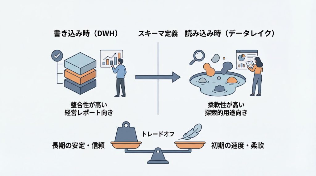 Schema-on-WriteとSchema-on-Readは、開発工数、データ品質、柔軟性の観点で異なるトレードオフを持ちます。プロジェクトのフェーズや目的(定型分析か探索的分析か)に応じた使い分けが重要です。