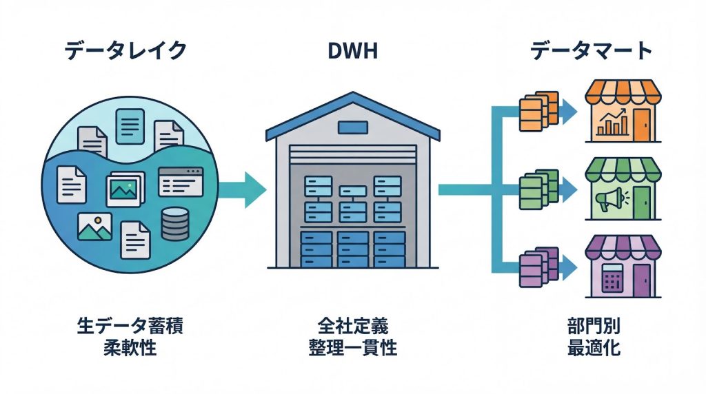 データレイクで柔軟性を、DWHで全社的な一貫性を、データマートで部門ごとの使い勝手を担保する役割分担が重要です。データレイクには生データを幅広く蓄積し、DWHで全社共通の指標や定義に基づいて整理し、データマートで各部門の業務に最適化した形でデータを提供する、という階層的な流れを設計することで、柔軟性と一貫性を両立させることができます。