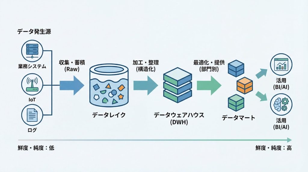 データマートとの関係:データレイク→DWH→データマートの階層構造
