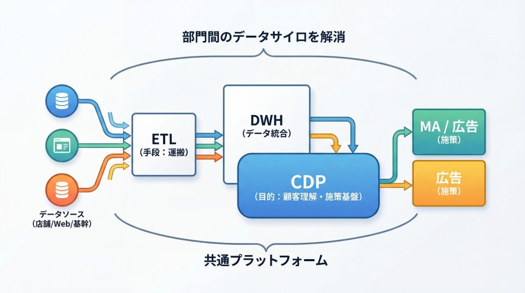 CDPとETLの違いとは?役割・配置関係・使い分けの判断基準を解説