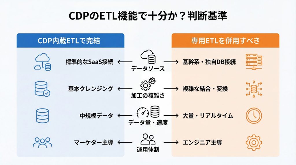 CDPのETL機能で十分かどうかを判断するには、以下のポイントを確認してください。