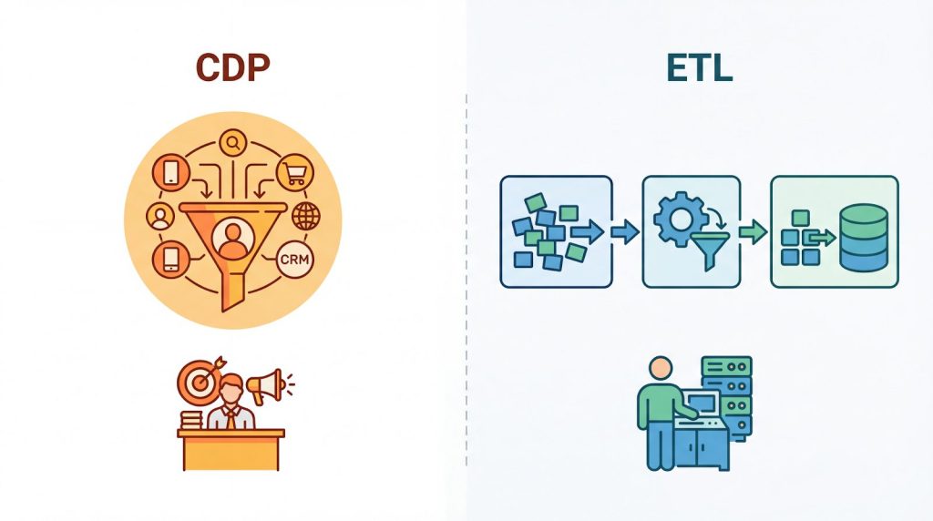 ETLは複数のシステムからデータを取り出し、加工して別の場所へ運ぶ「プロセス」を指し、主にデータエンジニアが扱う技術領域です。一方、CDPは顧客情報を一元化し、マーケティング施策に直接活用するための「プラットフォーム」であり、ビジネス部門が主導して使うツールとして位置づけられます。