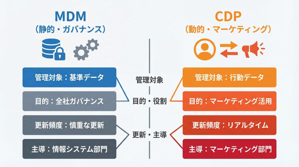 MDMとCDPは、どちらもデータを扱う基盤でありながら、管理対象や利用目的が根本的に異なります。MDMは「静的で全社共通の基準データ」を管理し、システム間の整合性を保つガバナンスの役割を果たします。一方、CDPは「動的で顧客中心の行動データ」を統合し、マーケティング施策の実行を支える活用基盤としての性格を持ちます。