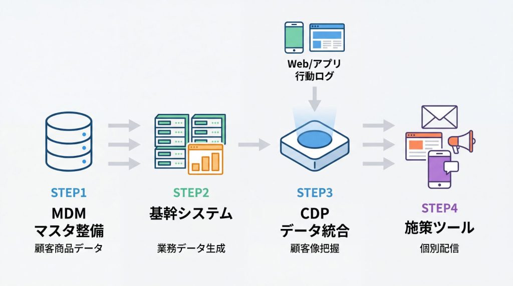 その後、基幹システムで発生した取引データや顧客情報をCDPへ連携し、Webサイトやアプリの行動ログと統合します。最後に、CDPで統合されたデータをもとに、メール配信ツールや広告配信ツールといった施策実行ツールへデータを送り、パーソナライズされた施策を実行します。