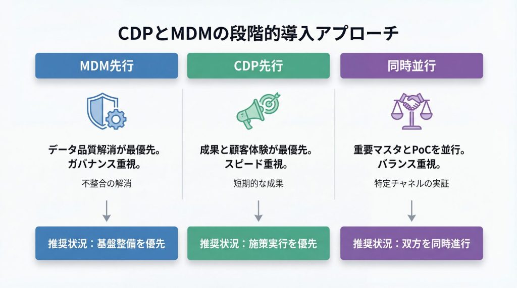 三つ目は「同時並行パターン」です。リソースが限られる場合は、最低限のMDM整備とCDPでの小規模な検証を並行させるアプローチが推奨されます。まず重要度の高いマスタ(顧客マスタや商品マスタ)のみをMDMで整備し、同時にCDPで特定のチャネルのデータ統合を試すことで、早期に効果を確認しながら段階的に拡大していくことができます。
