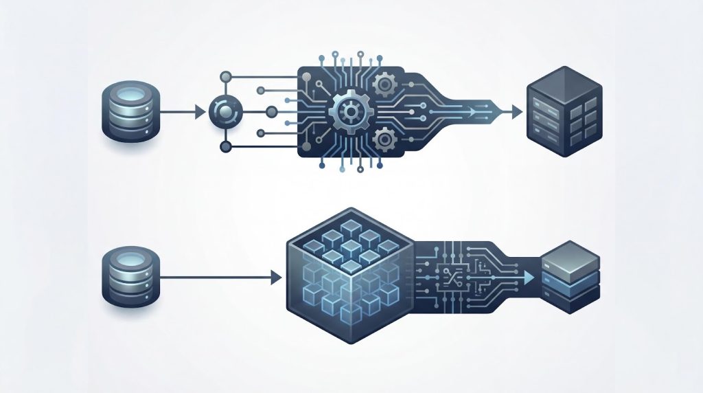 ETLとELTの決定的な違いは、データを「変換」するタイミングがロードの前か後かにあります。ETLは、DWHへのロード前にデータをクレンジング・整形し、必要なデータ量に絞ってから格納する手法です。一方、ELTは、生データをまずDWHへロードし、DWH内の高性能な計算エンジンを利用して必要な時に変換を行います。