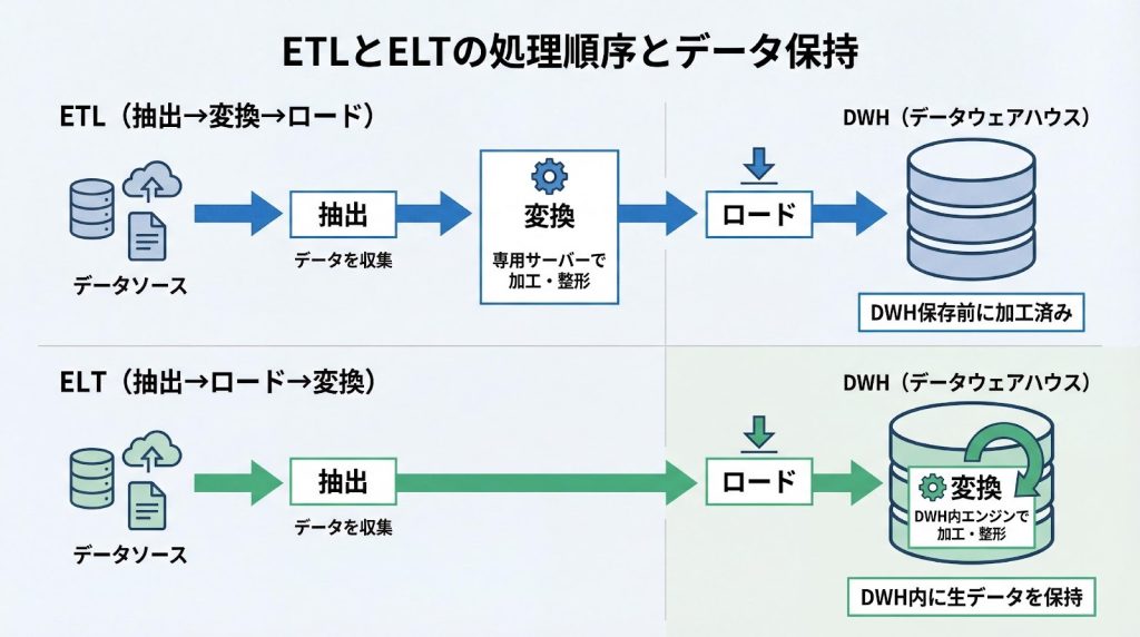 ETLとELTの最も大きな違いは、変換を行う場所とタイミングです。ETLでは変換後のデータのみをDWHに格納するため、元の生データは失われます。一方、ELTでは生データを保持するため、分析要件の変化に応じて変換ロジックを柔軟に変更できます。