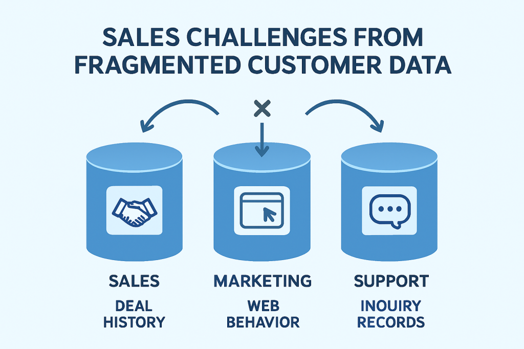 営業活動において、顧客の本質的なニーズや行動パターンを理解することは、成約率を左右する重要な要素です。しかし、多くの企業では顧客情報が営業部門、マーケティング部門、カスタマーサポート部門などに分散して管理されており、顧客の全体像を把握できていません。