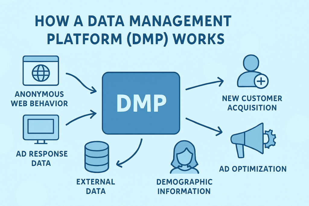 DMPとは、Data Management Platform(データマネジメントプラットフォーム)の略称で、主に匿名の顧客データを大規模に収集・統合・分析し、新規顧客の獲得や広告配信の最適化に活用するためのプラットフォームです。