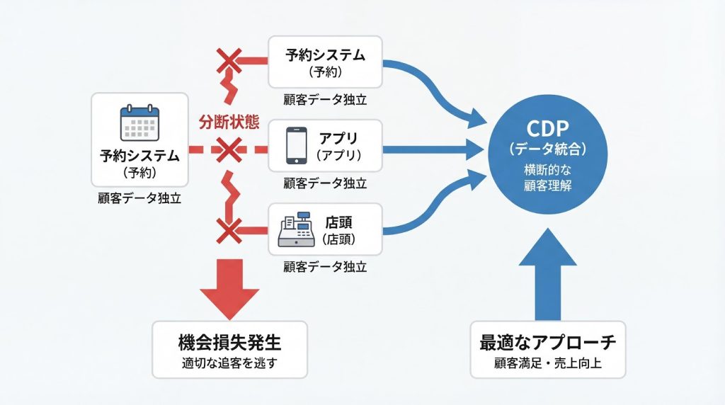 予約システム、アプリ、店頭オペレーションが独立して運用されている場合、顧客一人ひとりの行動を横断的に把握することができません。