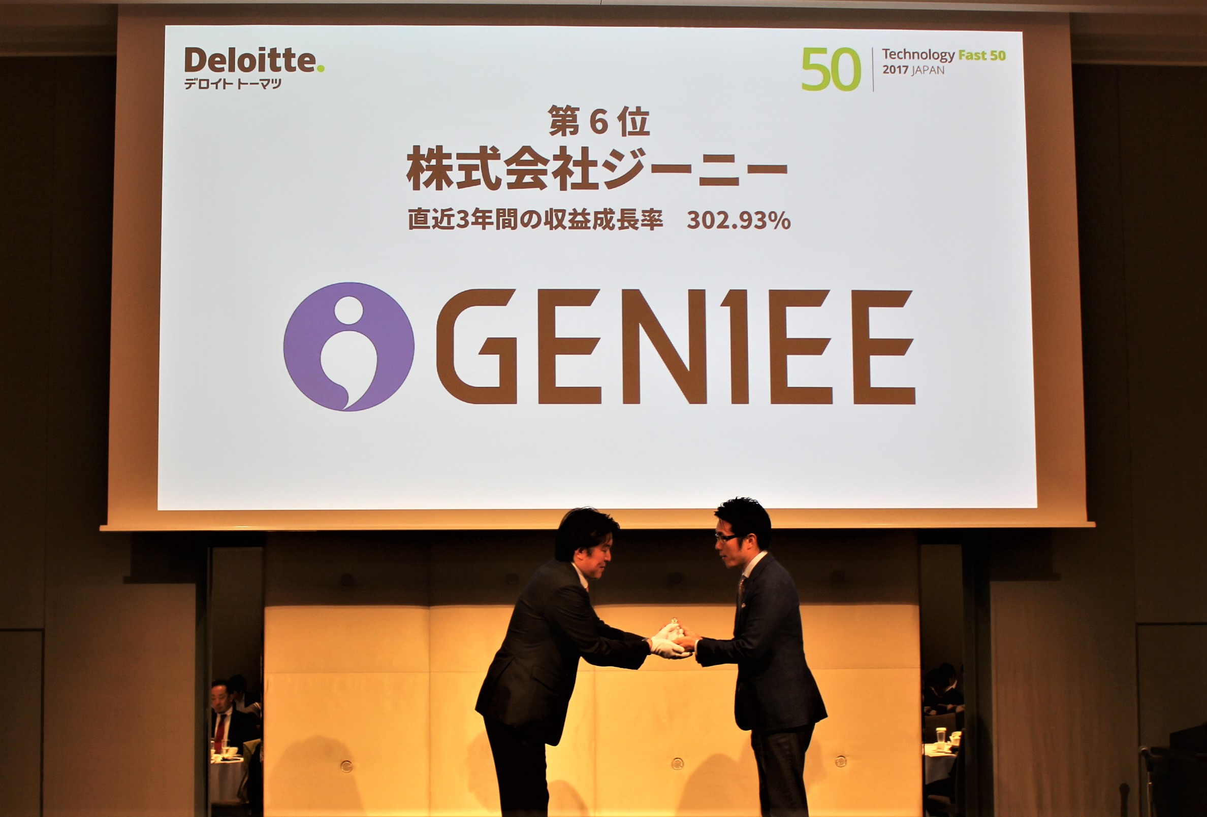 株式会社ジーニー(本社:東京都新宿区、代表取締役社長:工藤智昭)は、有限責任監査法人トーマツが発表したテクノロジー・メディア・テレコミュニケーション(以下、TMT)業界の収益(売上高)に基づく成長率のランキング、「デロイト トウシュ トーマツ リミテッド 2017年 日本テクノロジー Fast50」において、過去3決算期の収益(売上高)に基づく成長率303%を記録し、50位中6位を受賞いたしました。当社の受賞は、今年で5年連続となります。