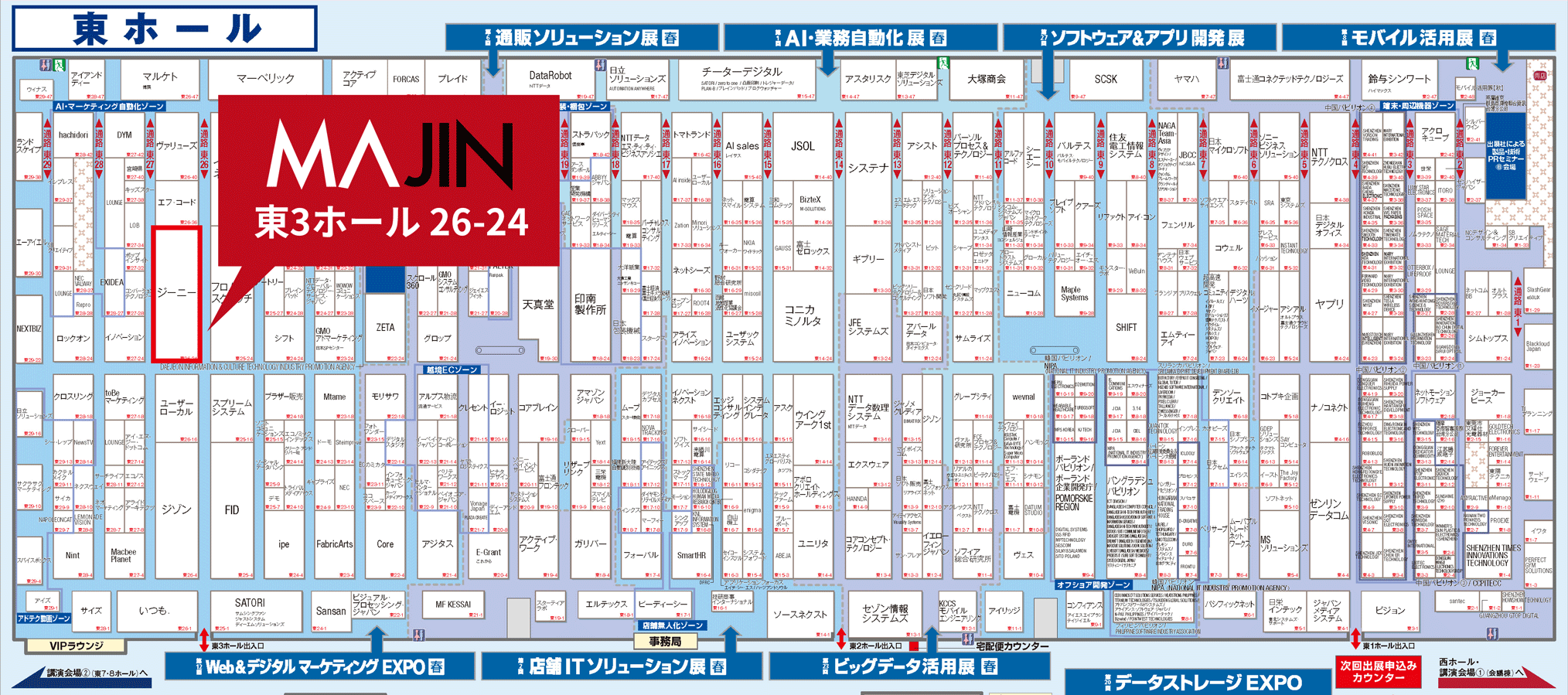 | 展示内容 | ・Web広告とアンノウンマーケティングでリード獲得を最大化するMAJINの「集客」 ・複数チャネルのコミュニケーションでリードを商談につなげるMAJINの「販促」 ・組織横断的なマーケティングと営業で受注率を飛躍的に高めるMAJINの「成約」 |