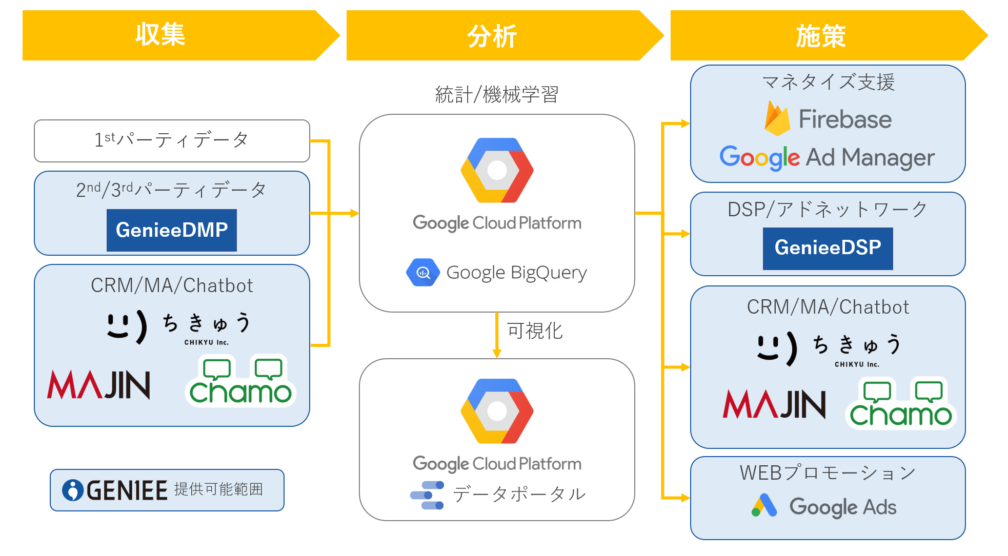 今後、ジーニーのテクノロジーやプロダクトに、GCP の BigQuery や Google Cloud Machine Learning 等のテクノロジーとを組み合わせることで、クライアント企業様にとってこれまで以上に適切なマーケティング支援を展開いたします。
