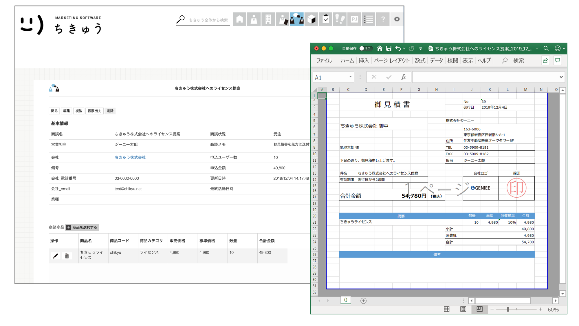 本機能により、「ちきゅう」上でシームレスに見積書や請求書など帳票の自動作成ができるようになりました。帳票のテンプレートはExcelで企業ごとにカスタマイズ可能となっており、お好きなレイアウトデザインでご利用いただけます。