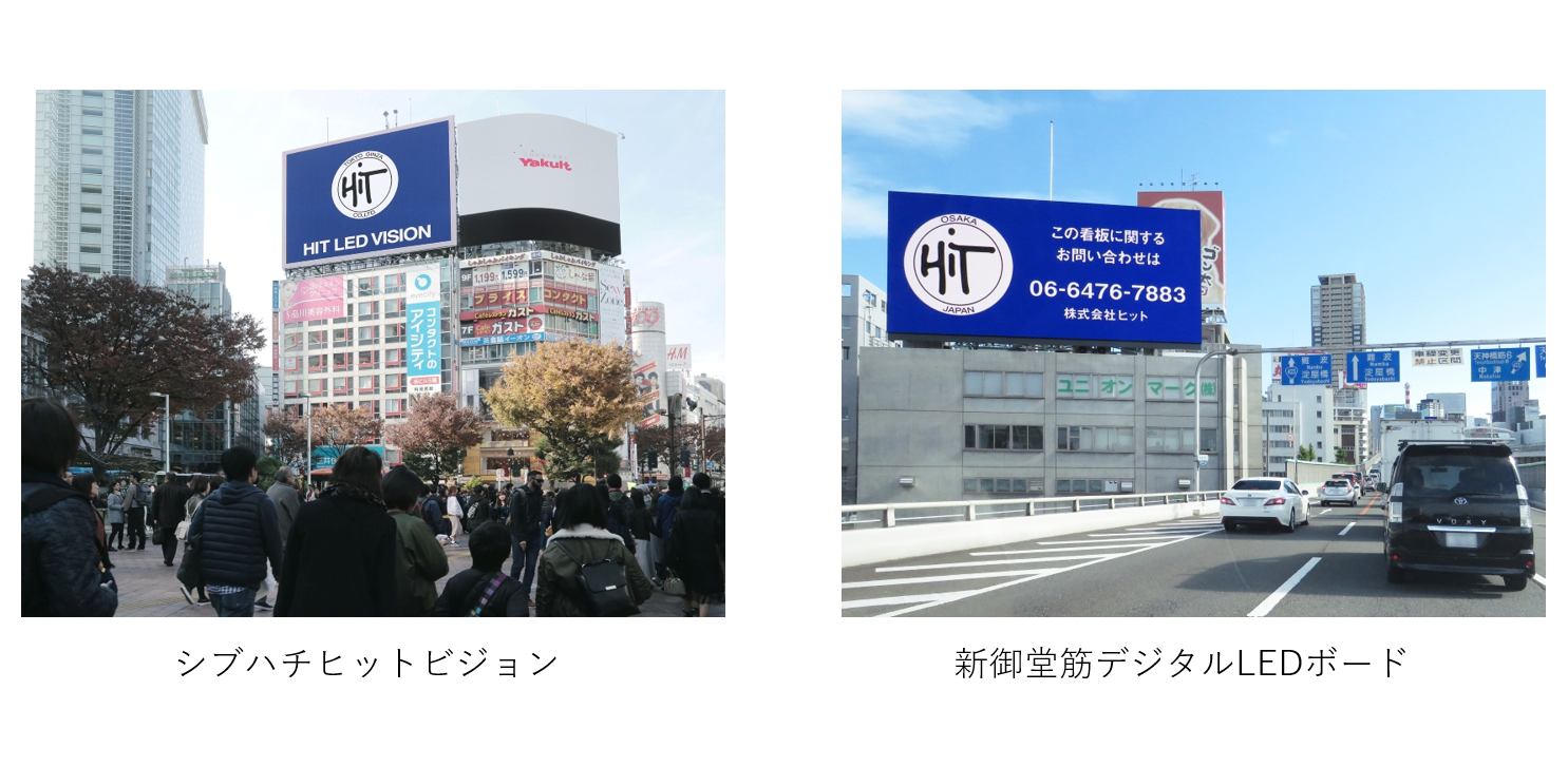 ヒットは東京・渋谷駅ハチ公口のスクランブル交差点や大阪・戎橋などの有名スポットに、日本最大級の広告ビジョンを保有・運営している屋外広告の専門会社です。