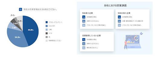営業管理に活用しているツールは「エクセル・スプレッドシート」が第1位、次いで「SFA」、「日報」という結果となりました。また営業課題についてはSFA導入や営業管理の有無にかかわらず、「新規顧客の開拓」が共通で第1位、「アプローチ先・やるべきことの明確化」が共通で第3位となりました。また、SFA未導入企業においては「営業・顧客情報のデータ化や情報共有」が営業課題の第2位となっています。