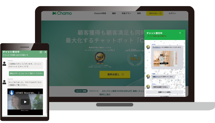 「Chamo」は累計導入社数4,500社を誇る、チャット型Web接客プラットフォームです。WEBサイト訪問者のフォローによる問い合わせ率向上、窓口や電話対応工数の削減に加え、サイトにおける離脱率の改善や質の高い接客の自動化などの機能強化を進めています。「Chamo」はコミュニケーションを最適化することで離脱防止と工数削減を実現します。