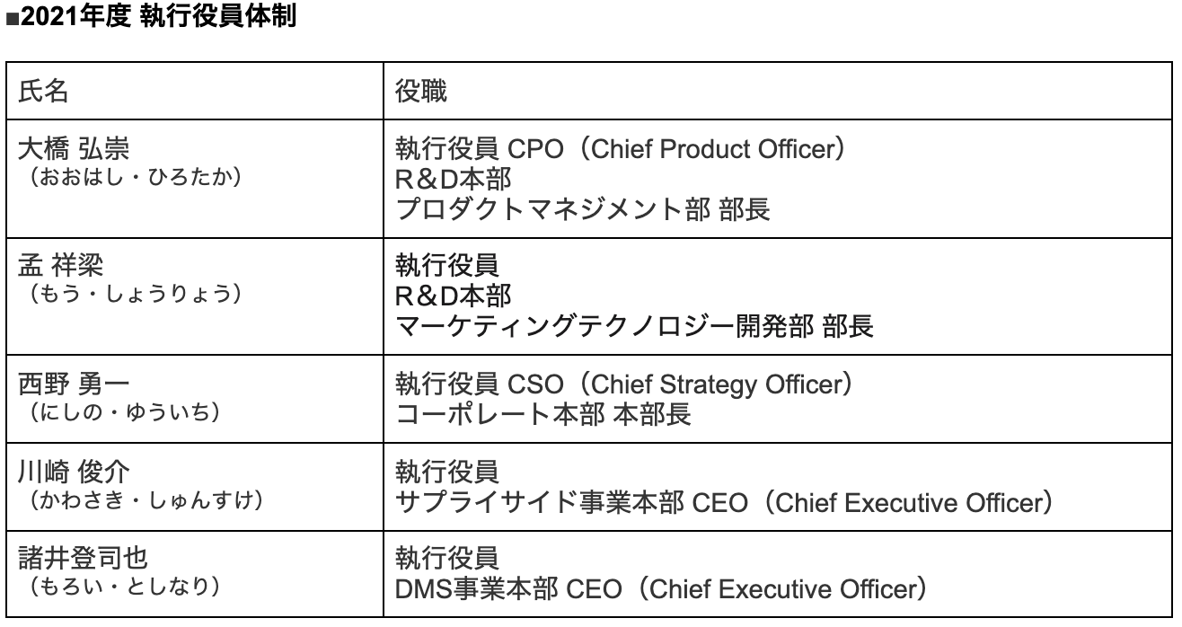 株式会社ジーニー(本社:東京都新宿区、代表取締役社長:工藤智昭、以下「ジーニー」)は、事業推進と組織拡大に向けた経営体制の強化を目的に、2021年3月24日開催の取締役会にて、2021年度の執行役員体制を決定いたしましたので、下記のとおりお知らせいたします。