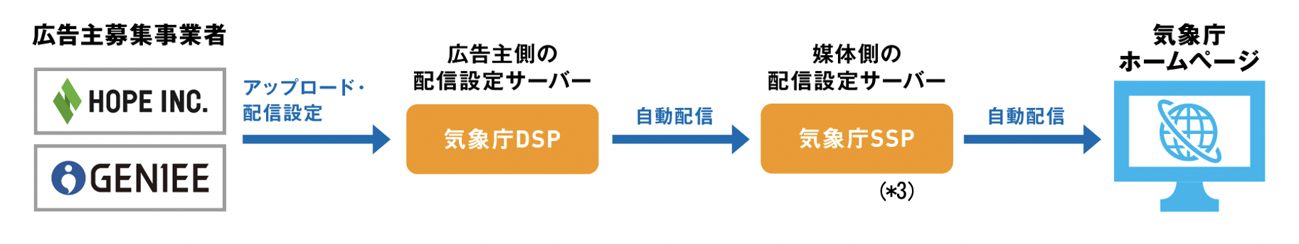 気象庁HPの広告運用事業の広告システム提供にあたり、ホープとの業務提携により共同で独自のシステム構築を行います。具体的には、気象庁専用のDSP(*1)を立ち上げ、外部のDSPとの接続を完全に遮断することにより、審査済み広告のみを繋ぐ形で運用し、審査フローを通過したもののみが広告配信サーバー上に登録・配信される仕組みです。本システムの開発と活用により、掲載可否の審査を通過した企業の広告内容のみを気象庁HPに配信可能になります。