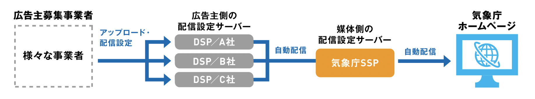 掲載可否審査を通過した企業のみを選定し、気象庁専用のDSPへ登録し、その後広告掲載(配信)が行われる。