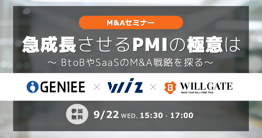 株式会社ジーニー(本社:東京都新宿区、代表取締役社長:工藤智昭、以下ジーニー)は、2021年9月22日(水)に開催されるウェビナー「急成長させるPMIの極意は~BtoBやSaaSのM&A戦略を探る~」(主催:株式会社ウィルゲート)に登壇いたします。