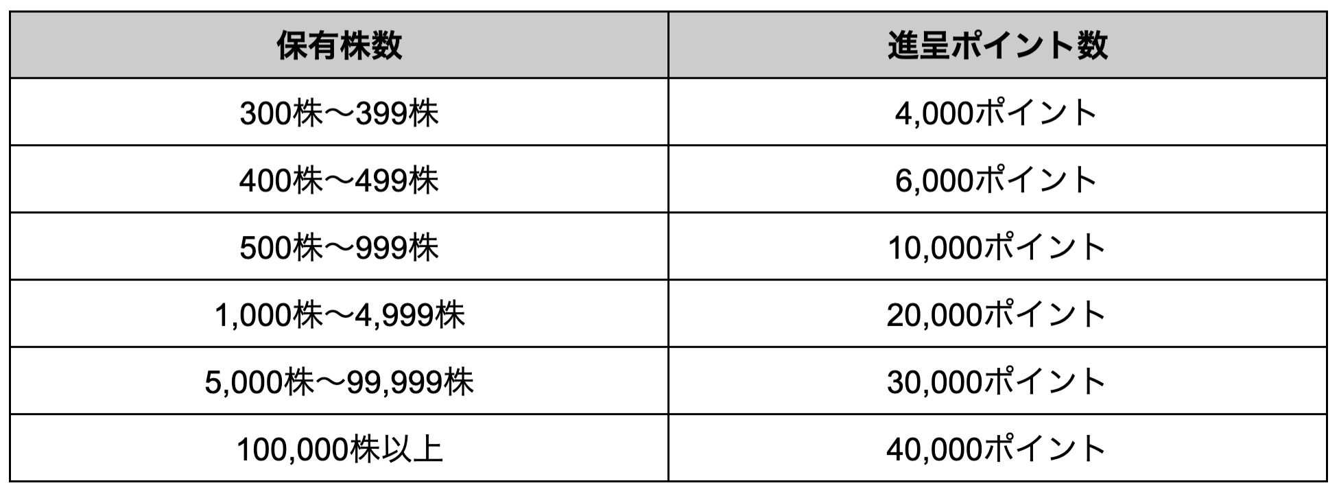 2022年以降、毎年3月末日の株主名簿に、3単元(300株)以上保有する株主様として記載されること。