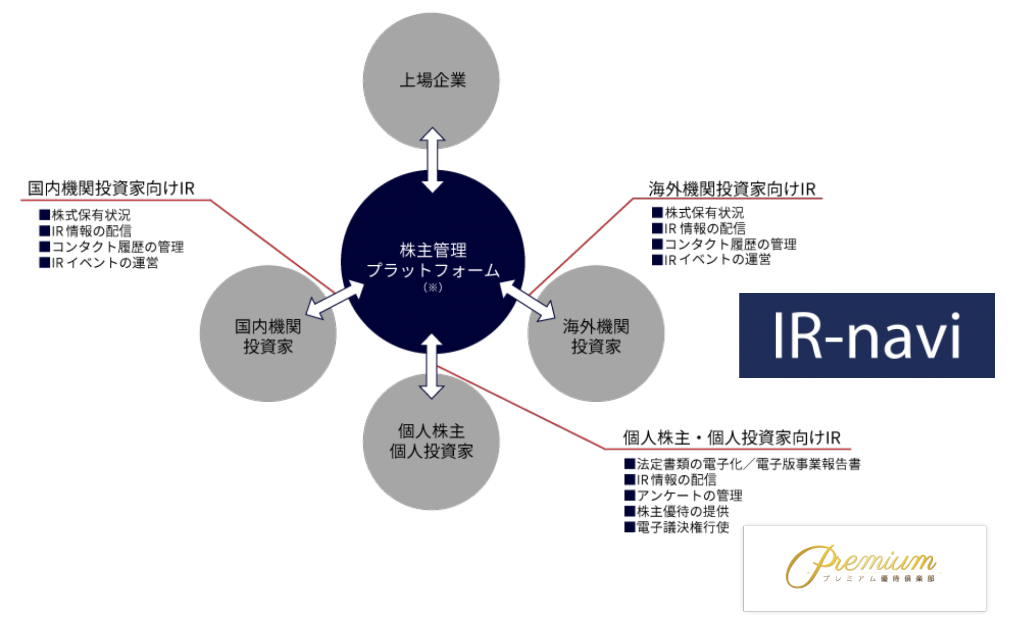 事業内容:プレミアム優待倶楽部、及びプレミアム優待倶楽部PORTALの運営、IR-naviの運営、ESGソリューション(統合報告書・アニュアルレポート等の企画・制作)、バーチャル株主総会、オンライン決算説明会