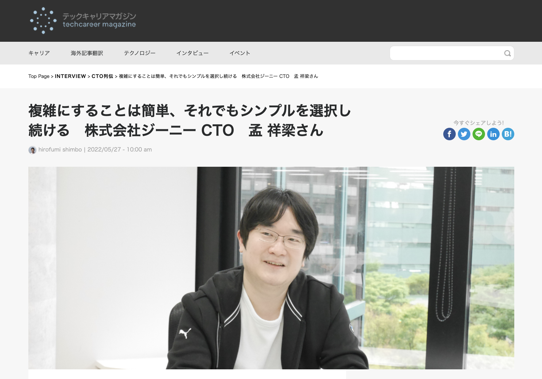 株式会社アイデンティティーが運営する、エンジニア向けWebメディア「テックキャリアマガジン」に、弊社CTO 孟祥梁のインタビューが掲載されました。 「テックキャリアマガジン」掲載記事はこちら 「CTO列伝」複雑にすることは簡単、それでもシンプルを選択し続ける 株式会社ジーニー CTO 孟 祥梁さん