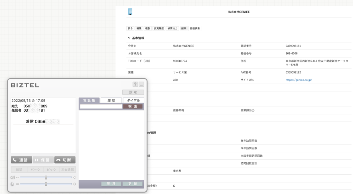 「GENIEE SFA/CRM」に電話番号が登録されている顧客から着信があった際に該当顧客の詳細情報が「GENIEE SFA/CRM」画面上に表示されます。
